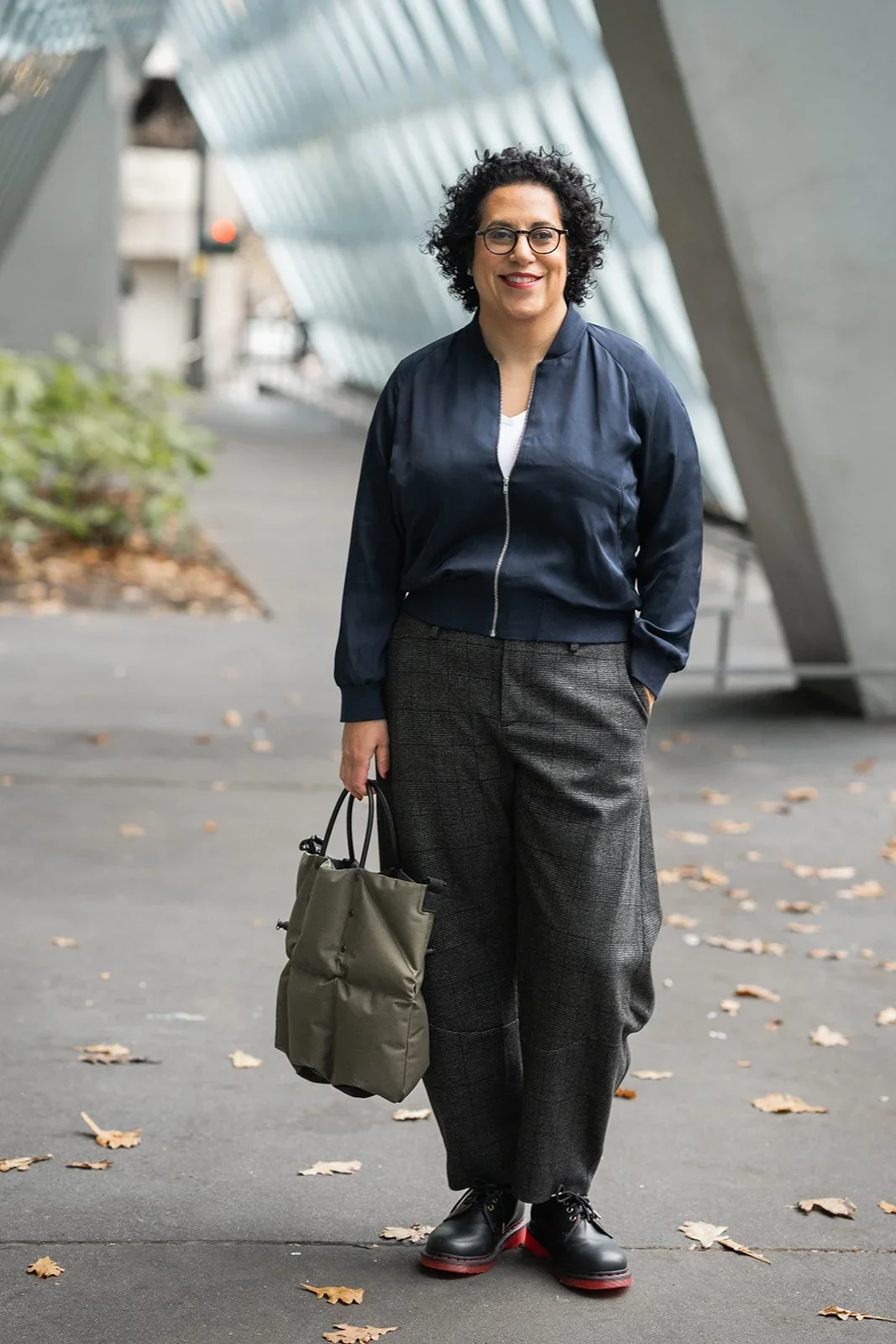 The key to rocking the barrel pant trend is to ensure that the pants keep their silhouette and don’t pool at the ankle. Yes, this can be done with a full length pant. But, it’s trickier than going for an ankle length. If you really want to stick with a full length pant, make sure the length is right, then various shoe styles can work. If they feel a little long and are pooling, go for a high heel or a sockless shoe pairing to make them more feminine and to get that desired barrel shape. Here’s one last photo of me from Continuum. In it, I’m wearing full length vegan leather barrel pants. I’ll be hemming them to be ankle length. But for now, this works. And fun fact, I picked these up on the Anthro site from Nuuly, so they were rentals before. The price was about 30% of the full price for the same pants. Keep in mind that Nuuly purchases are final sale and “as is” so sometimes items will have damaged zippers, etc.